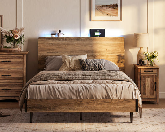 Bed Frame, Upholstered Platform Frame with Storage Headboard, LED and Charging Station
