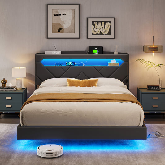 Floating Bed Frame with Headboard, Black Queen Size Bed Frames with Storage