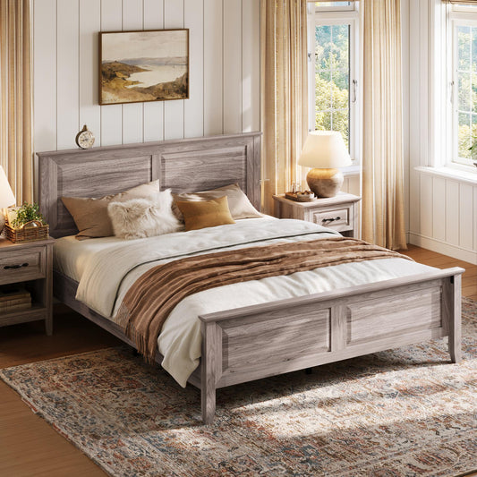 Wood Queen Bed Frame with Headboard and High Footboard, Farmhouse Style