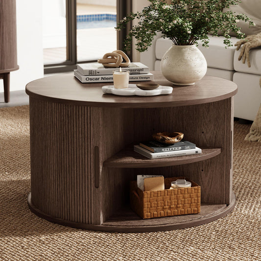 Round Fluted Coffee Table with Large Storage, Mid-Century Style, Sliding Tambour Door for Living Room