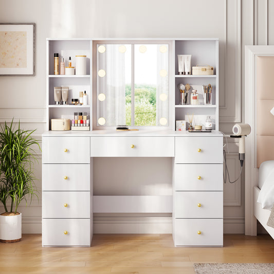 47" Make Up Vanity Desk with Mirror, Lights, Shelves & Charging Station