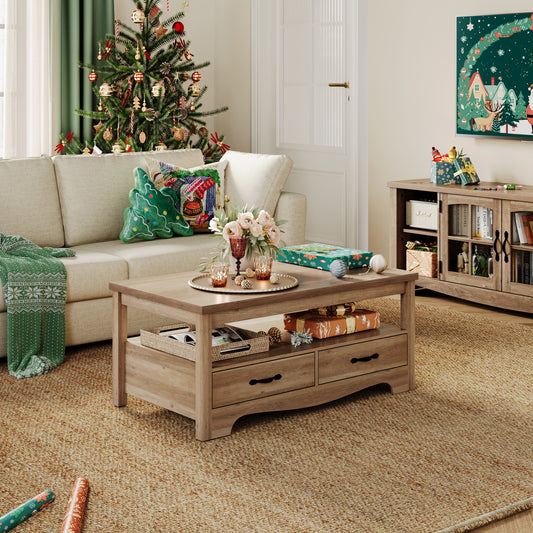 Farmhouse Coffee Table with Drawers, Rustic Living Room Storage