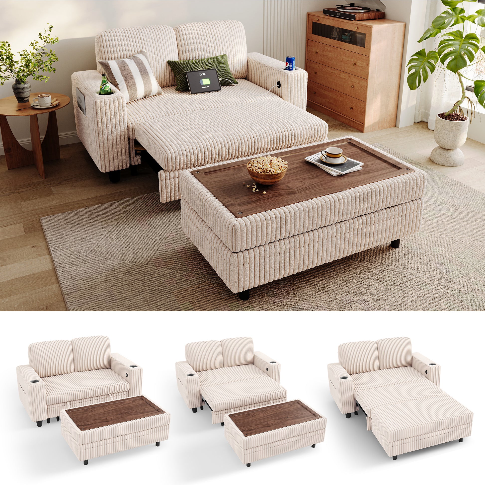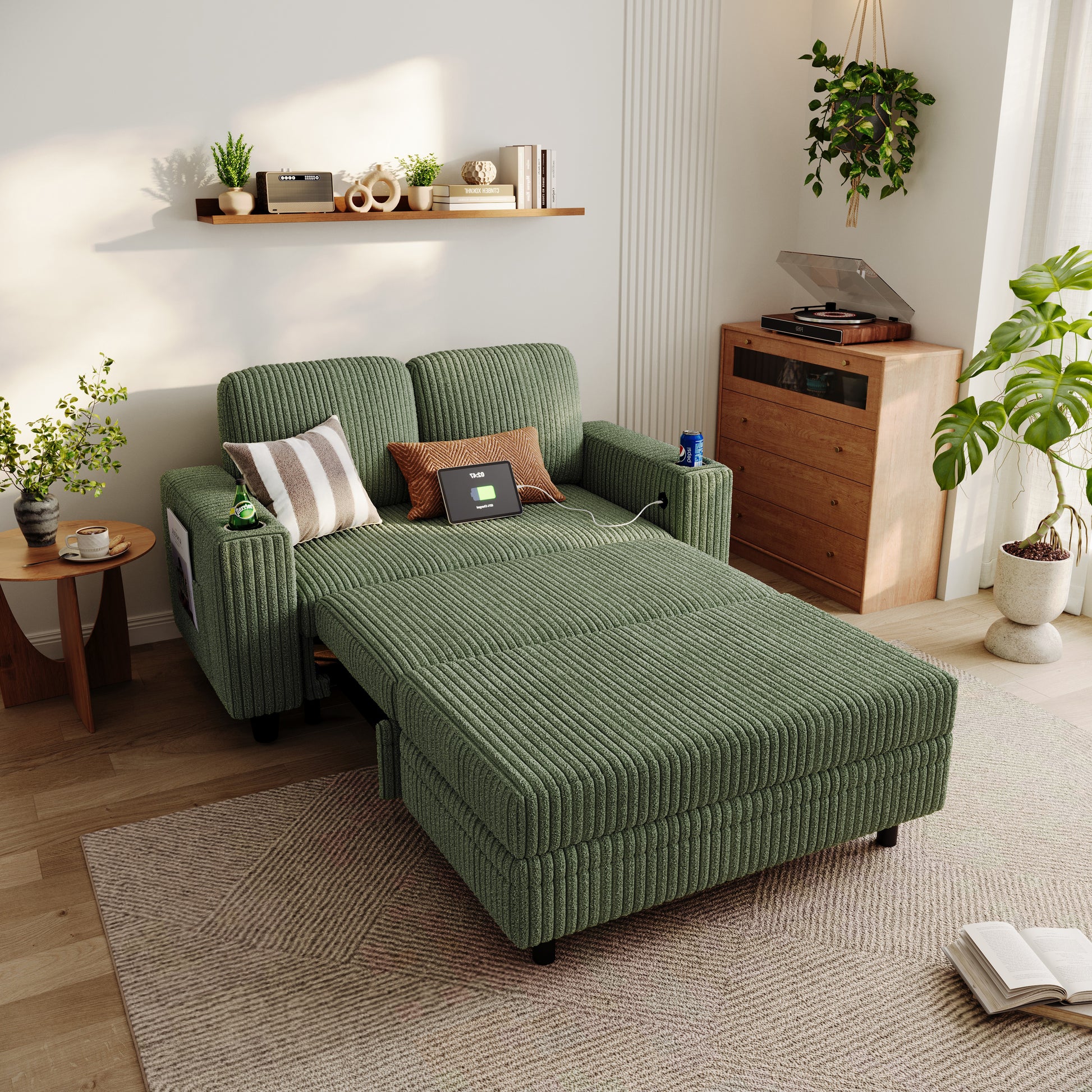 Comfy 2-in-1 loveseat with pull-out couch chaise, USB charging, and cup holders. Ideal for small spaces, studios, or guest rooms.