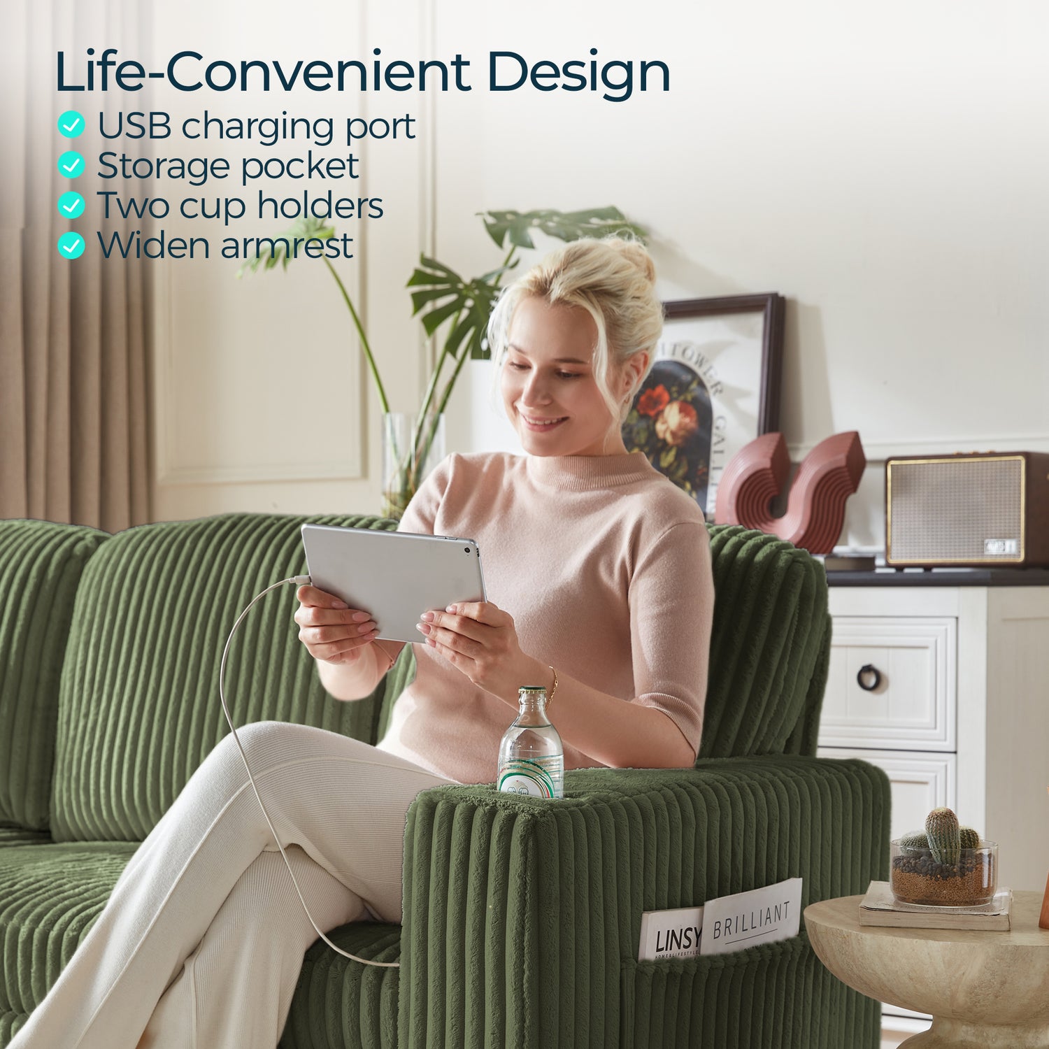 Designed with everyday living in mind, this sofa includes a USB charging port for easy power access, storage pockets for remotes or magazines, and integrated cup holders to keep drinks secure. A thoughtful setup that brings more convenience to your routines.