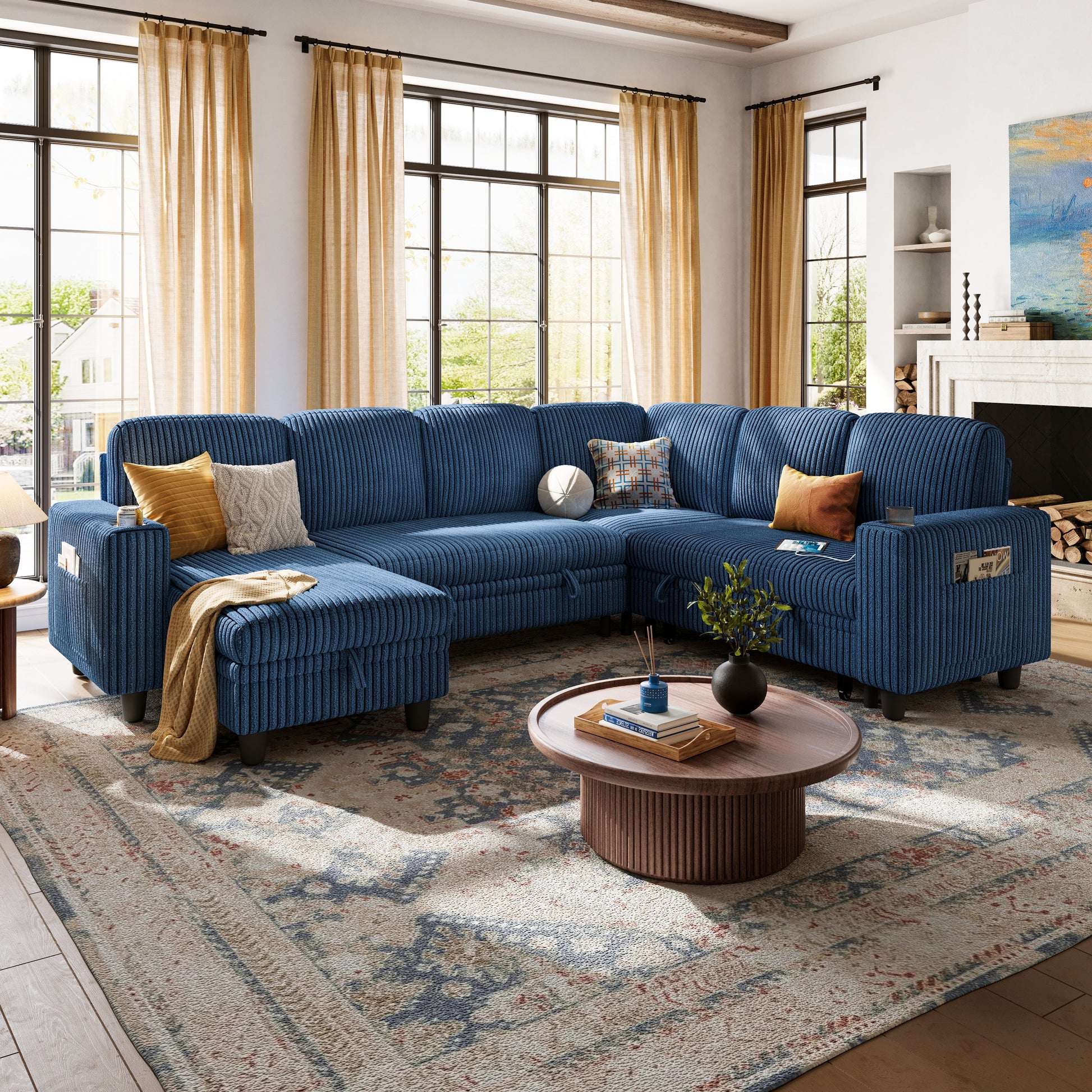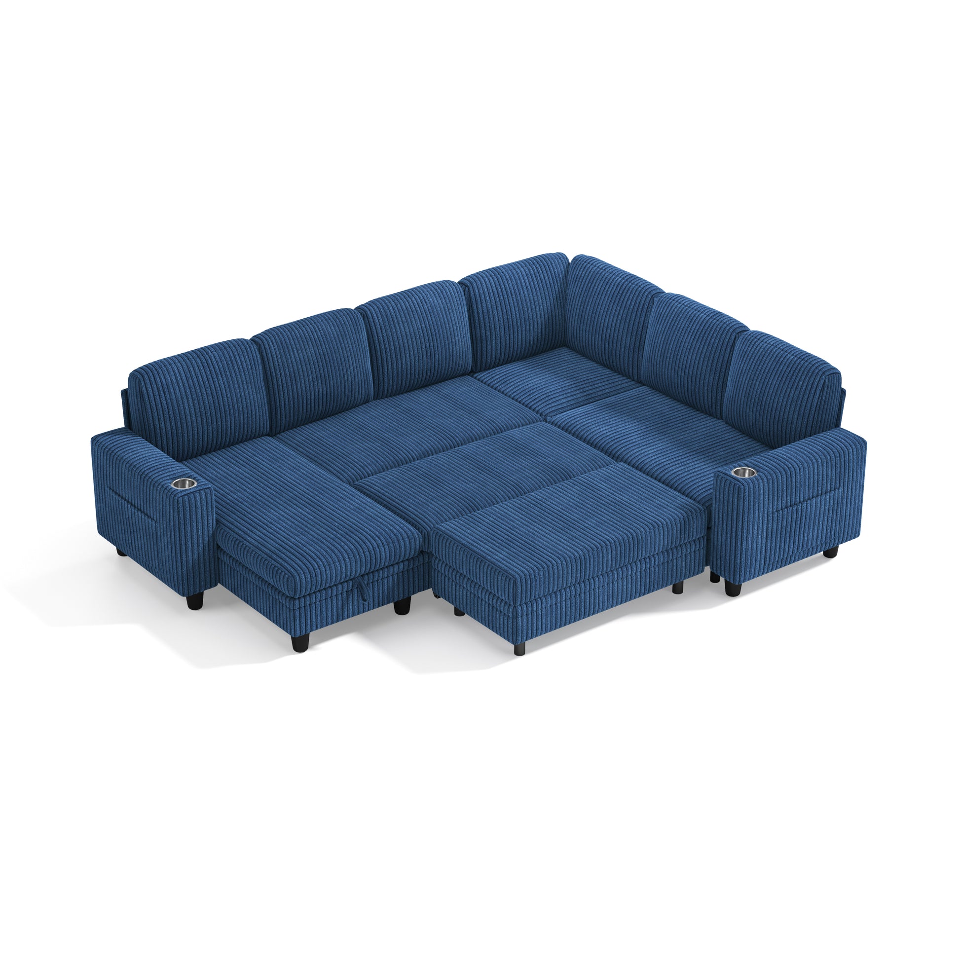 Convertible 6-seat corduroy cloud couch with 2 ottomans—modular, cozy, and perfect for family lounging or flexible living room layouts.