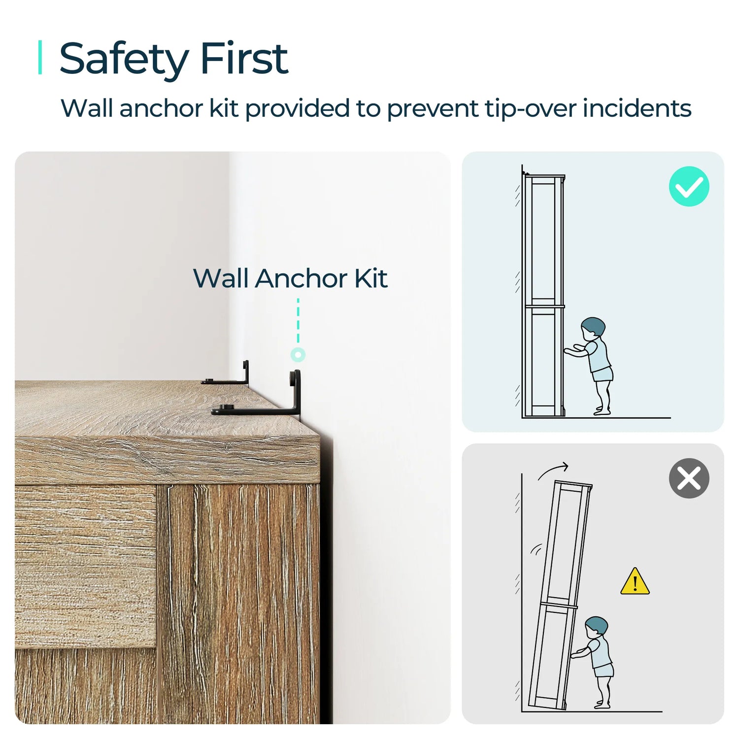 Wall anchor kit provided to prevent tip-over incidents. The back of the bookcases are also equipped with a stabilizing device, which makes the book shelf more stable and durable.