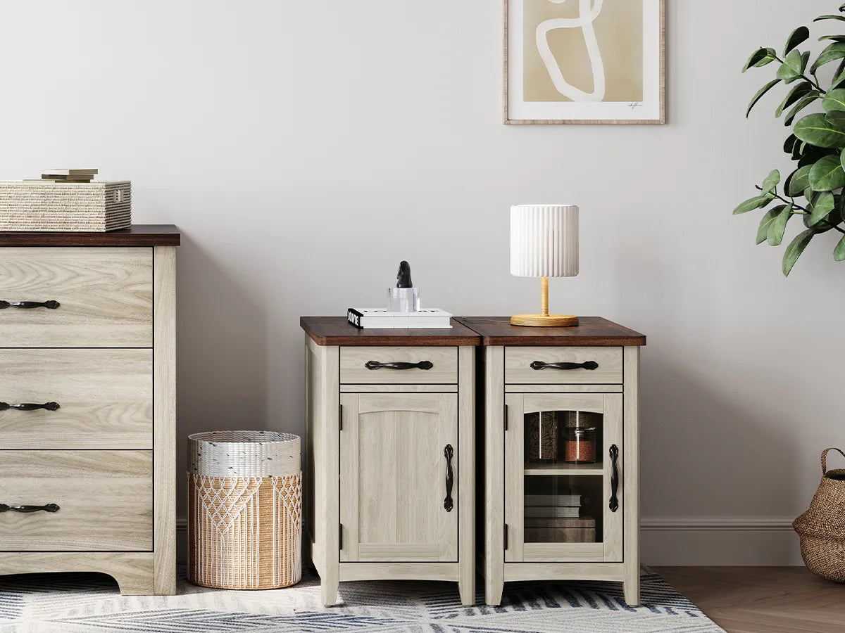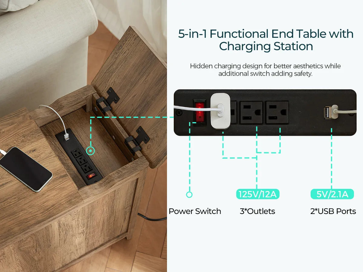 Stay organized and charged with End Table featuring a charging station, 3 outlets, and 2 USB ports. The detachable holder keeps essentials handy, while the farmhouse-inspired nightstand, made of sturdy engineered wood, complements any decor