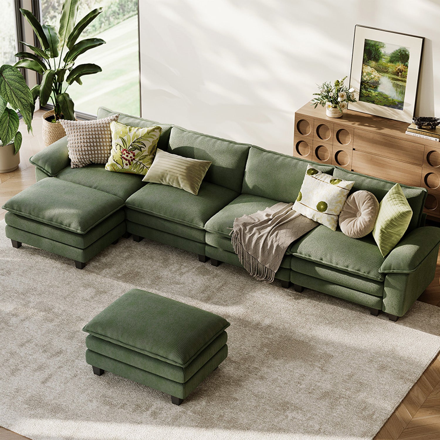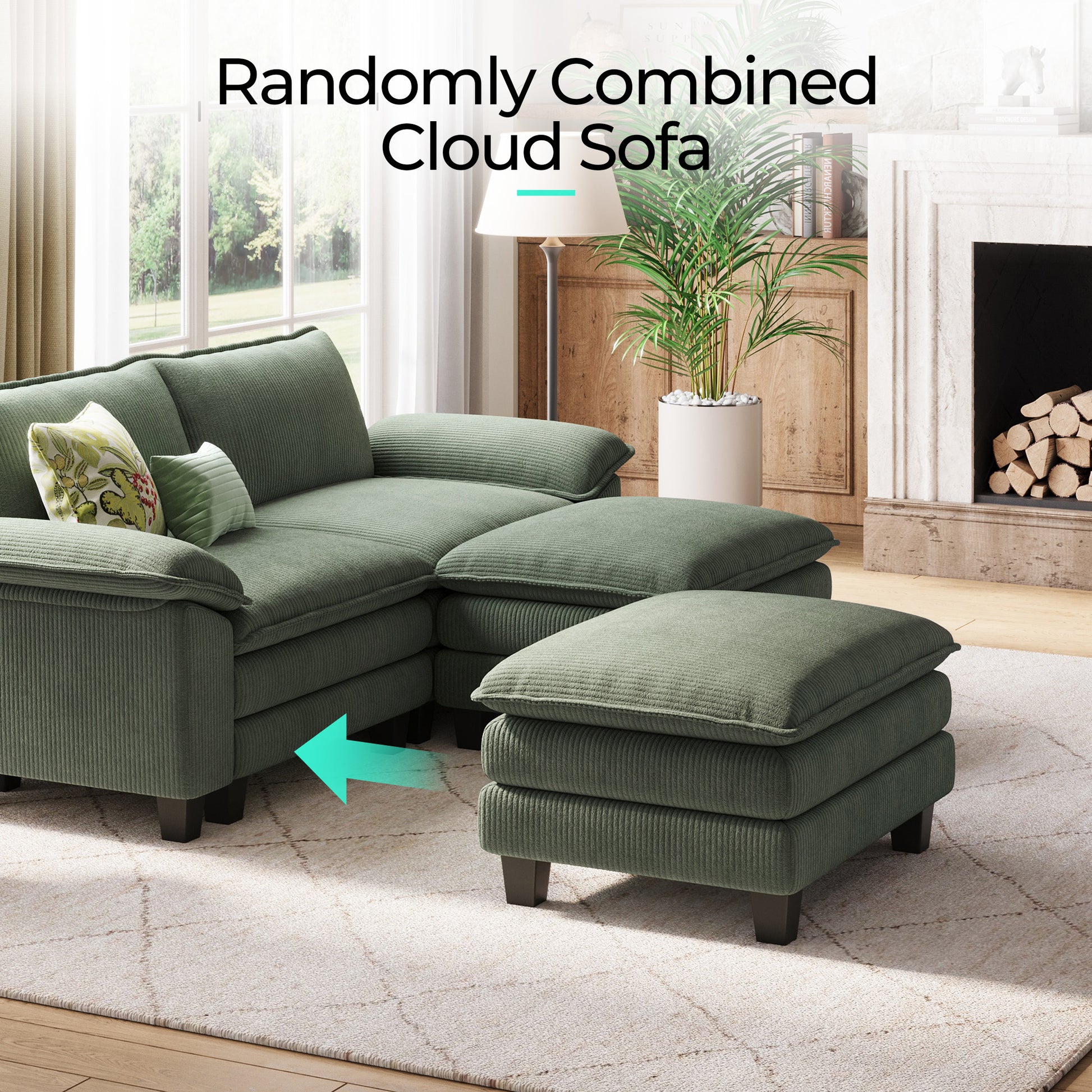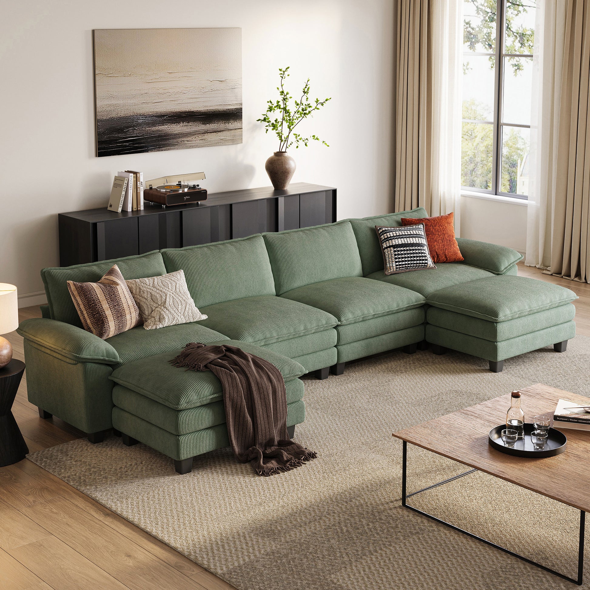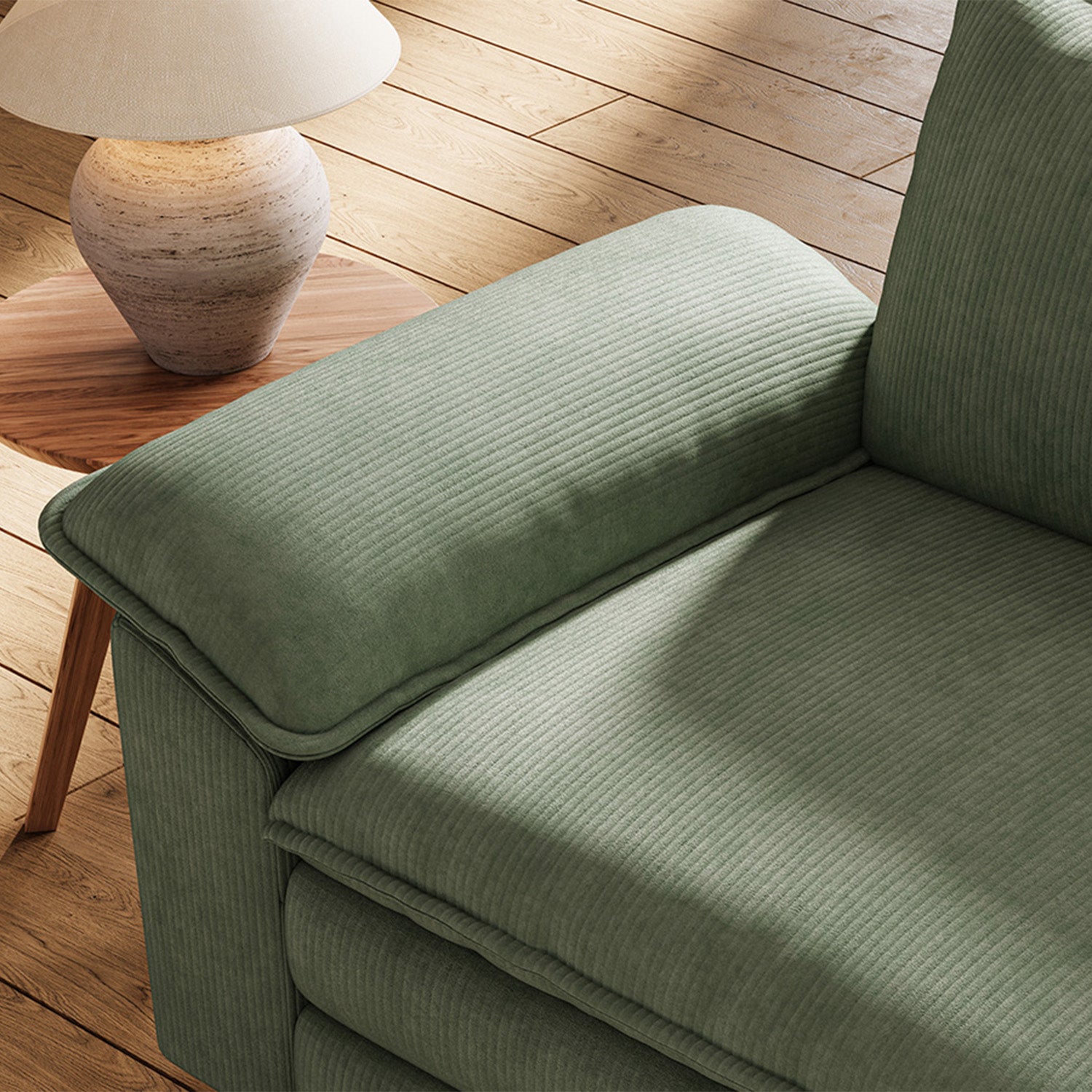 Wrapped in soft corduroy, this cloud-like modular sofa blends deep, sink-in comfort with a clean, modern silhouette, enhanced by wide pillow arms and dual-layer cushions for a relaxed yet refined lounge experience. Designed for effortless customization, each module can be reconfigured to suit your space and style.