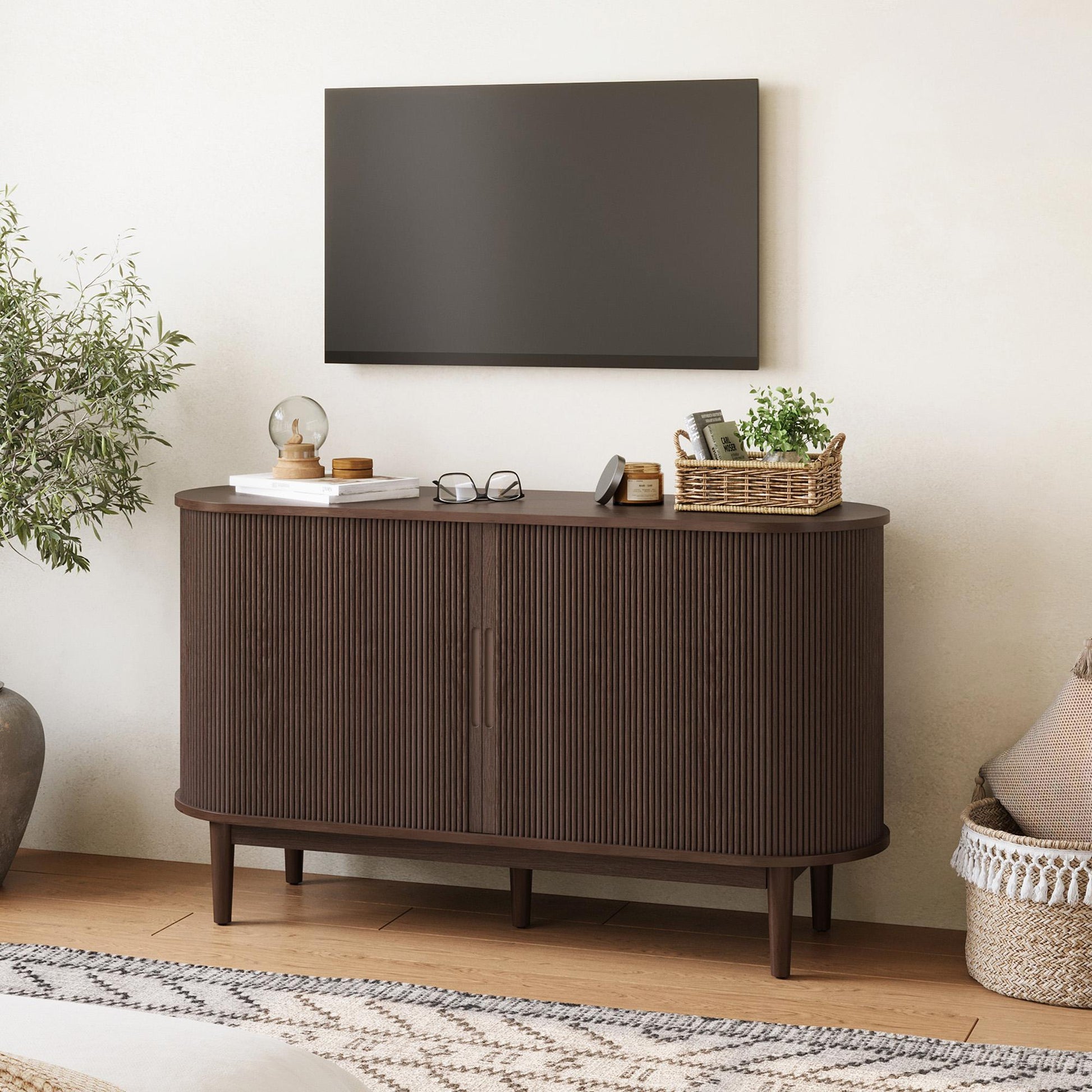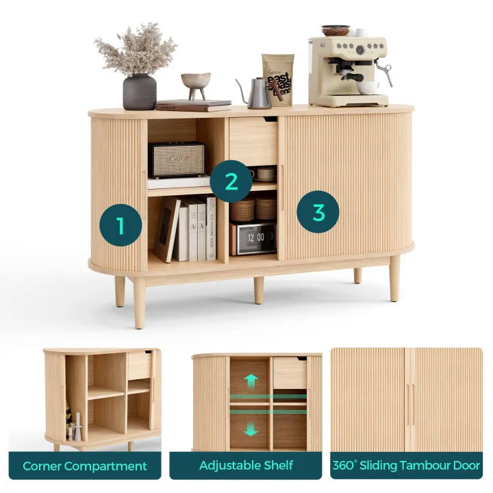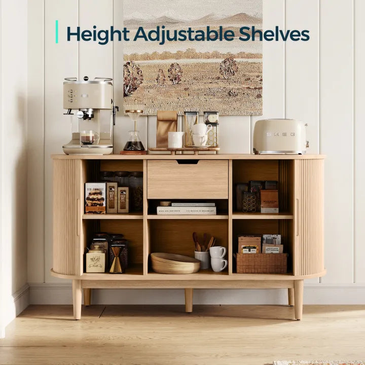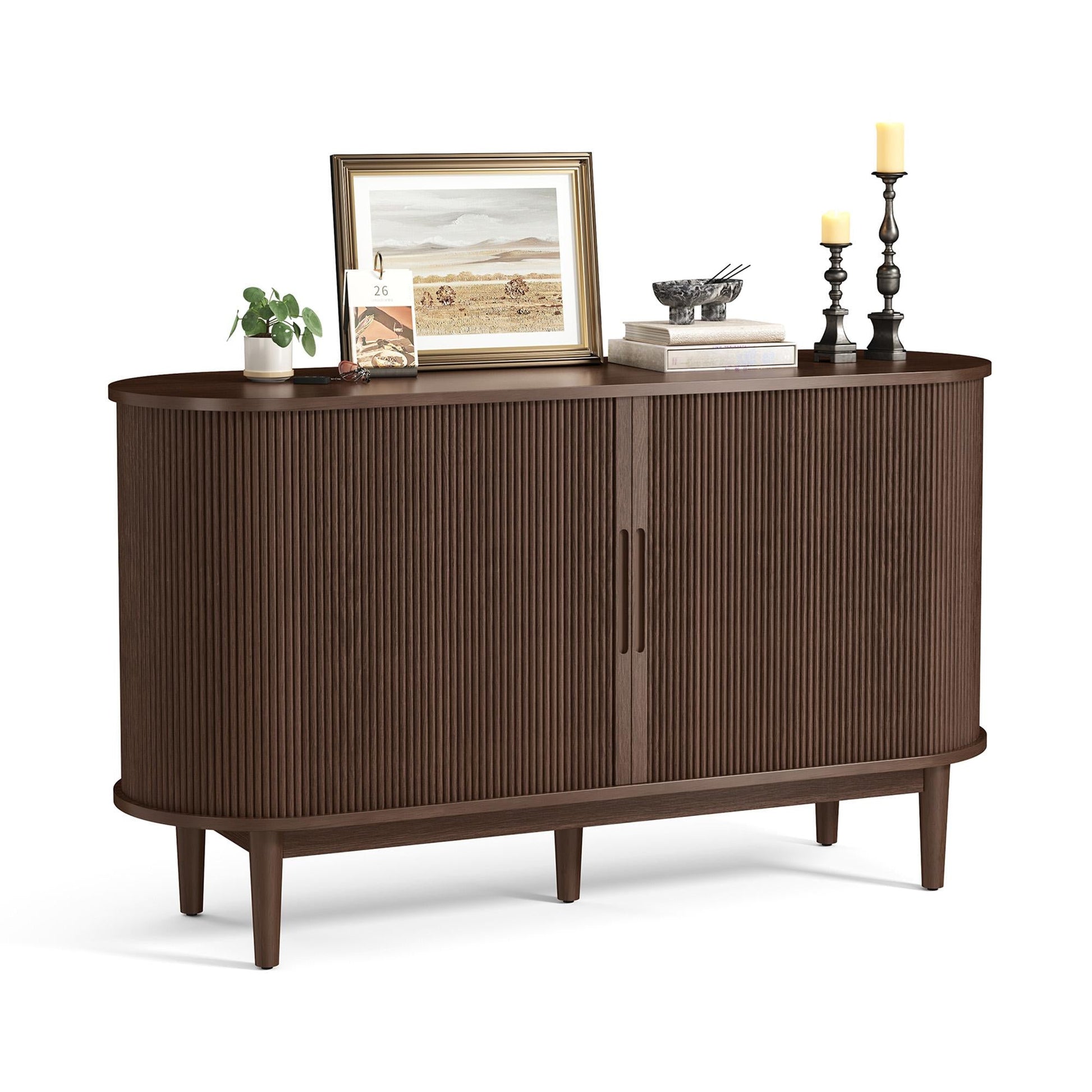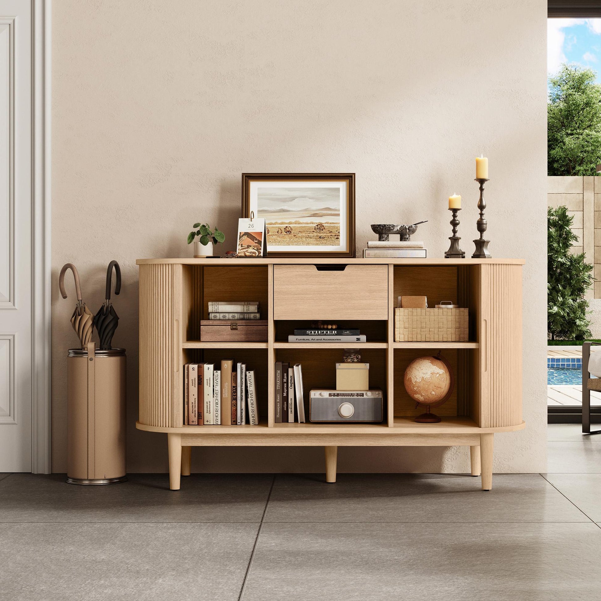 The curved, fluted tambour door glides smoothly for easy access to essentials, and combined with the natural wood color, this sideboard cabinet provides practical storage space while adding a touch of mid-century modern elegance to your home