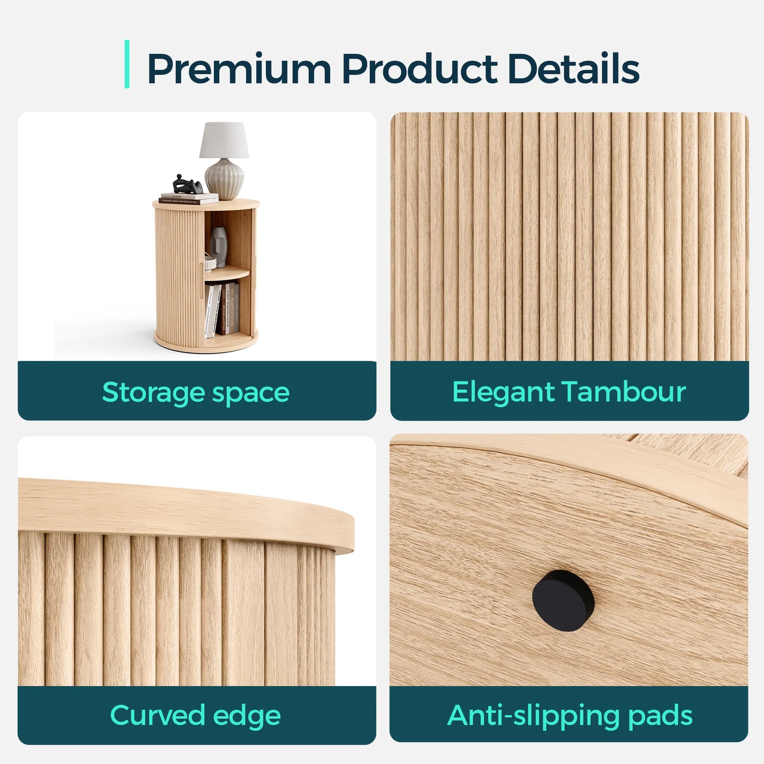 With its distinctive curved silhouette and fluted tambour sliding door design, this round end table blends effortlessly into your room, adding a touch of sophistication and a warm, welcoming ambiance to your home