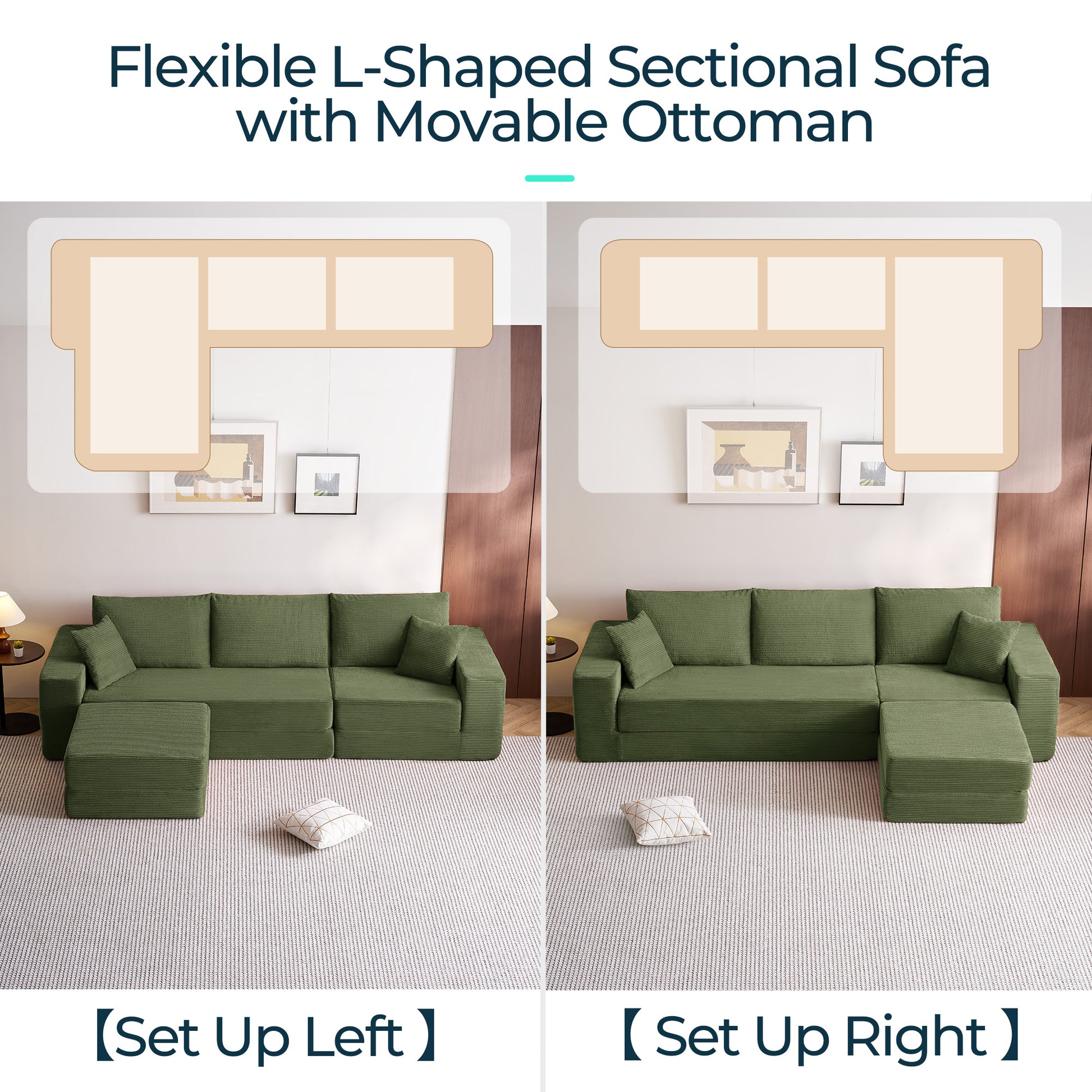 Oversized convertible corduroy sofa bed with ottoman and pillows, featuring a modular L-shaped floor couch design ideal for living rooms and apartments.