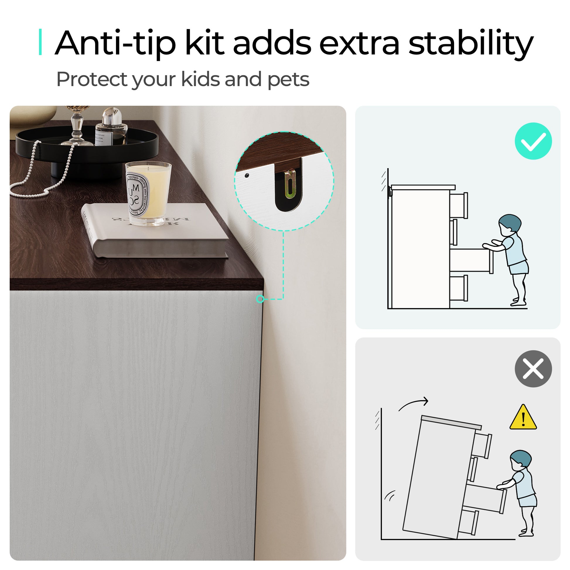 Designed with family safety in mind, this dresser includes a built-in anti-tip kit to help prevent accidental tipping and ensure greater stability—especially important in homes with children or pets. The secure wall-anchoring hardware offers peace of mind by keeping the dresser firmly in place, even when drawers are fully extended.