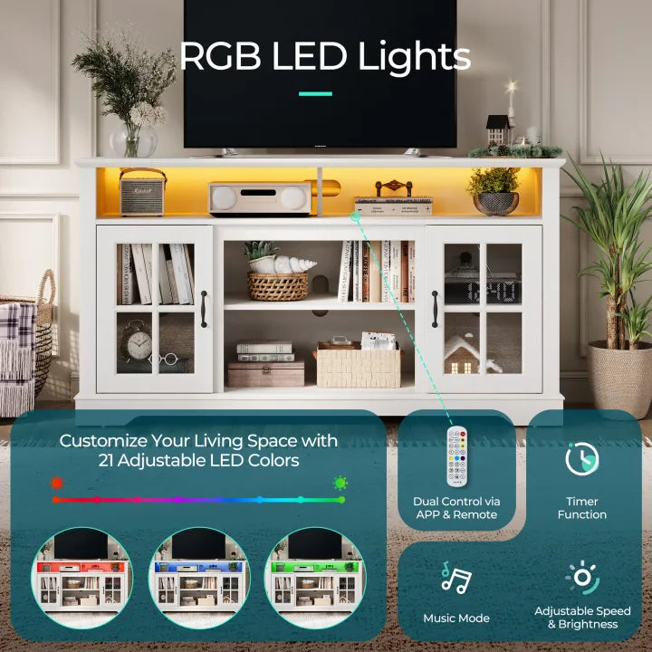 Modern Glass TV Stand for 65" TVs, Entertainment Center with LED Lights, Storage Cabinets & Adjustable Shelves