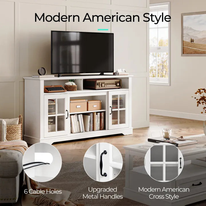 At 59 inches long, this white TV stand accommodates TVs up to 65 inches, with ample room for a soundbar or decor. It features a storage cabinet with glass doors and two open shelves, offering plenty of space for game consoles, set-top boxes, and DVD players