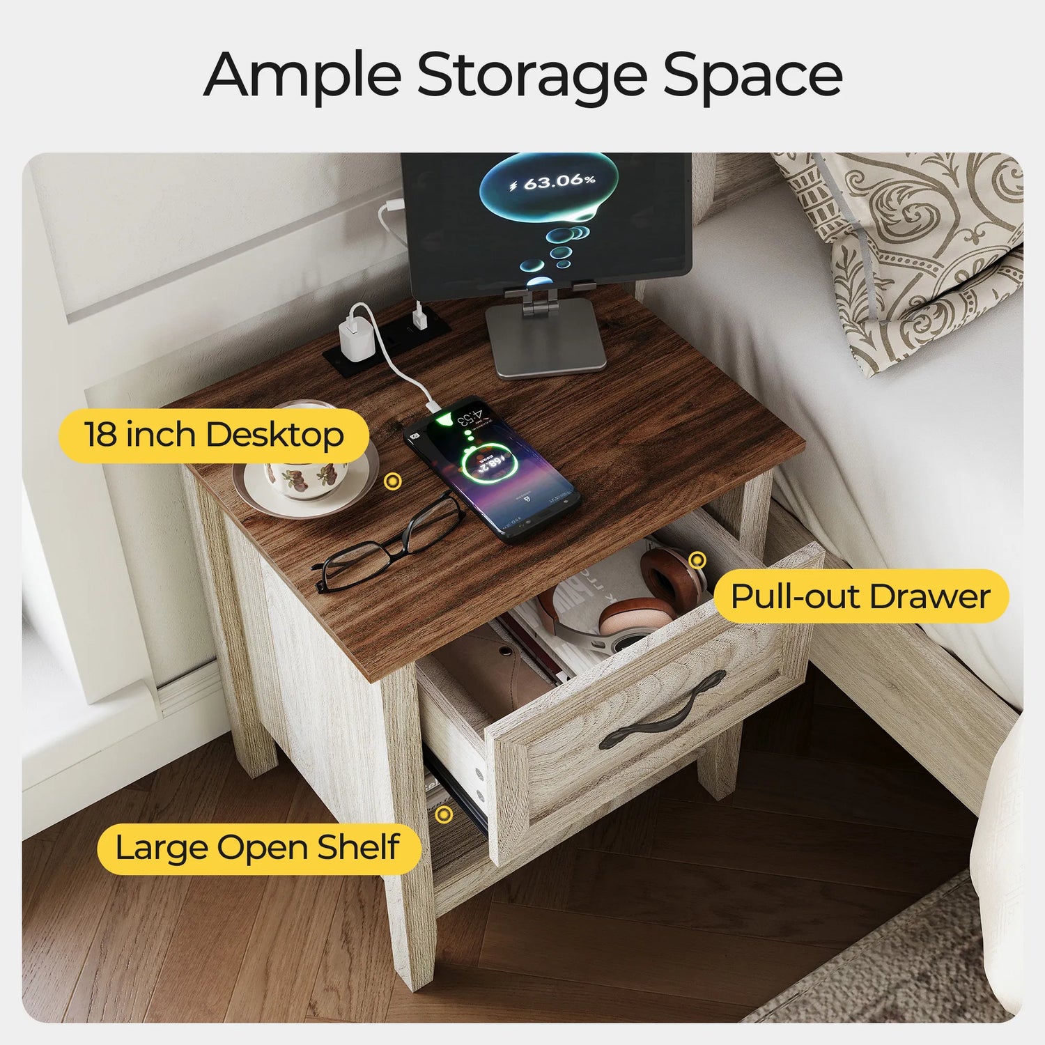 Nightstand for Bedroom with Charging Station, Farmhouse End Tables for Living Room with Drawer